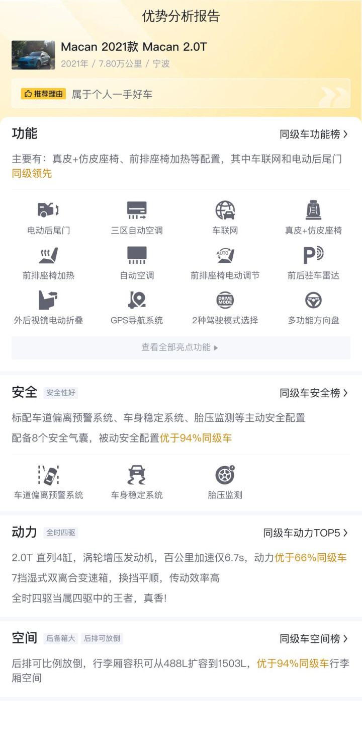 如图片所示,这辆Macan是2021款的入门版车型,采用的是2.0T的动力配置。它的定位是中型SUV,至今已经行驶了7.8万公里,且没有过户记录。车辆是在2021年9月上牌的,到现在大约使用了4年的时间。车源地和上牌地都是在宁波,这点需要注意,因为会影响到车辆迁徙过程中的成本。另外,这辆车的外观颜色是蓝色,内饰颜色为深色。